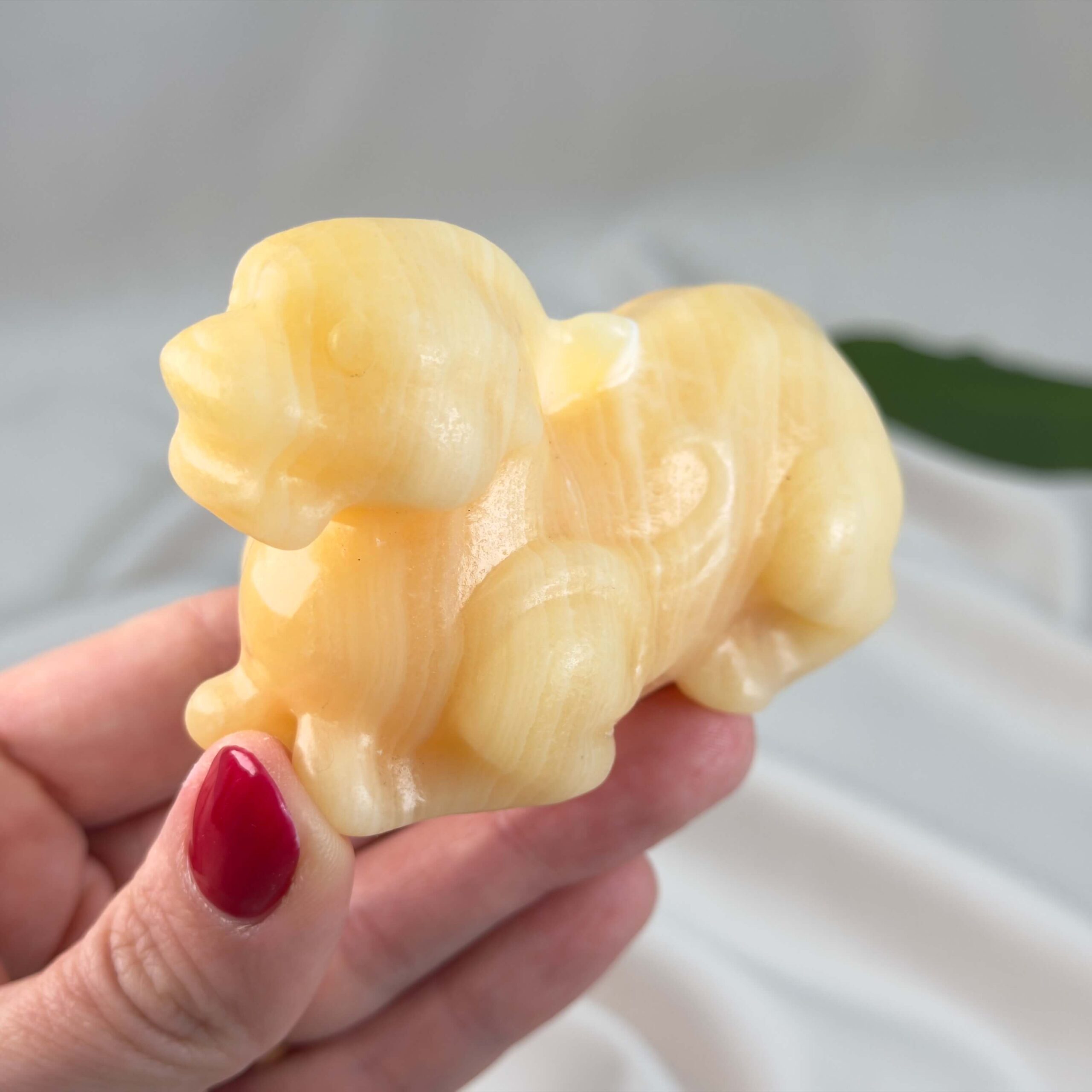 Gul Calsit Foo Dog er en unik krystaludskæring, hvor varme nuancer og detaljeret design går hånd i hånd. Den gyldne farve varierer fra lys til dybere toner og giver et levende spil i stenen. Den karakteristiske form skaber et kraftfuldt og dekorativt udtryk, som skiller sig ud. Gul Calsit Foo Dog er ideel som et personligt element i hjemmet, hvor den tilfører både varme, stil og naturlig elegance.