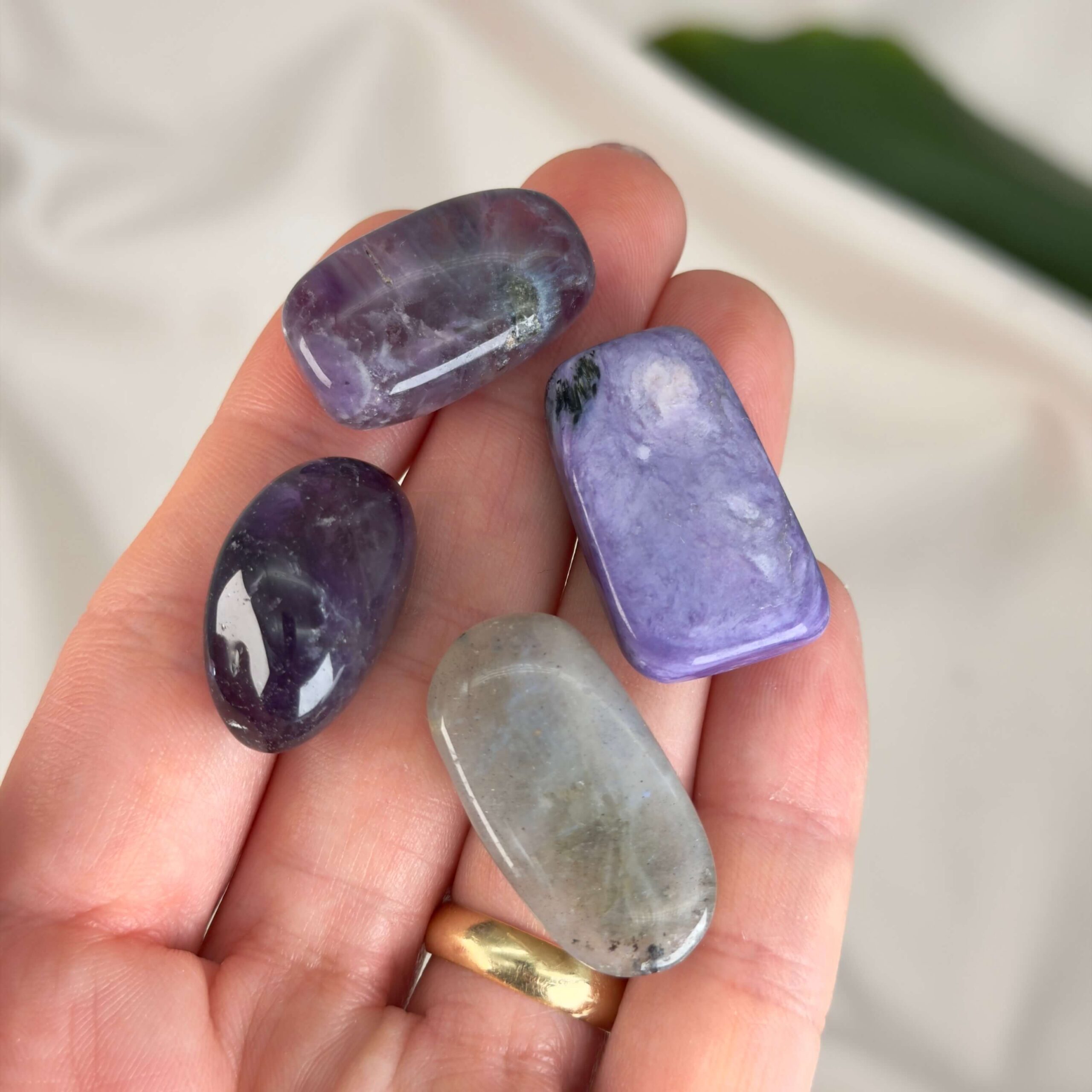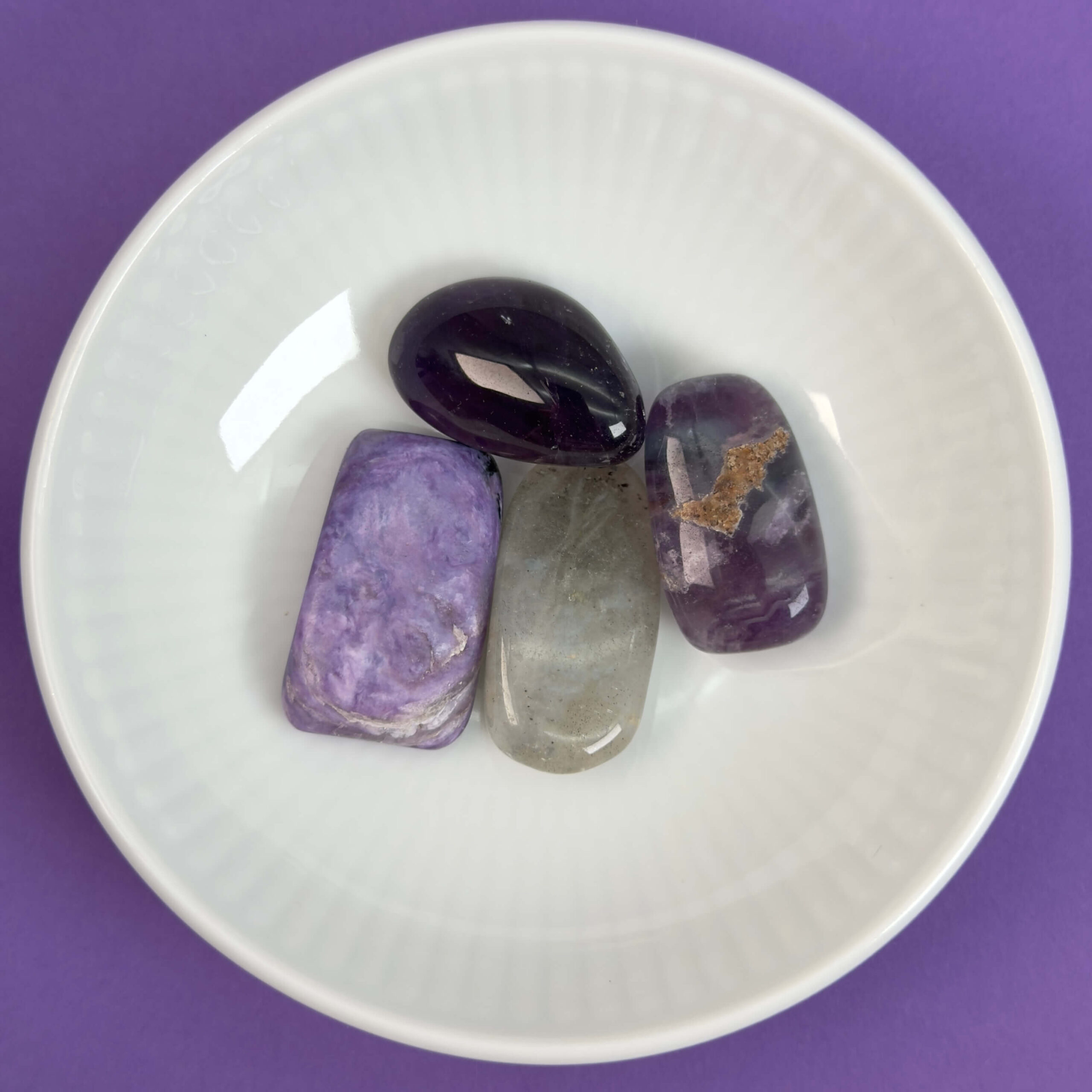 Ametyst og labradorit støtter intuition, mens fluorit hjælper med fokus, og charoit åbner for dybere indsigt.