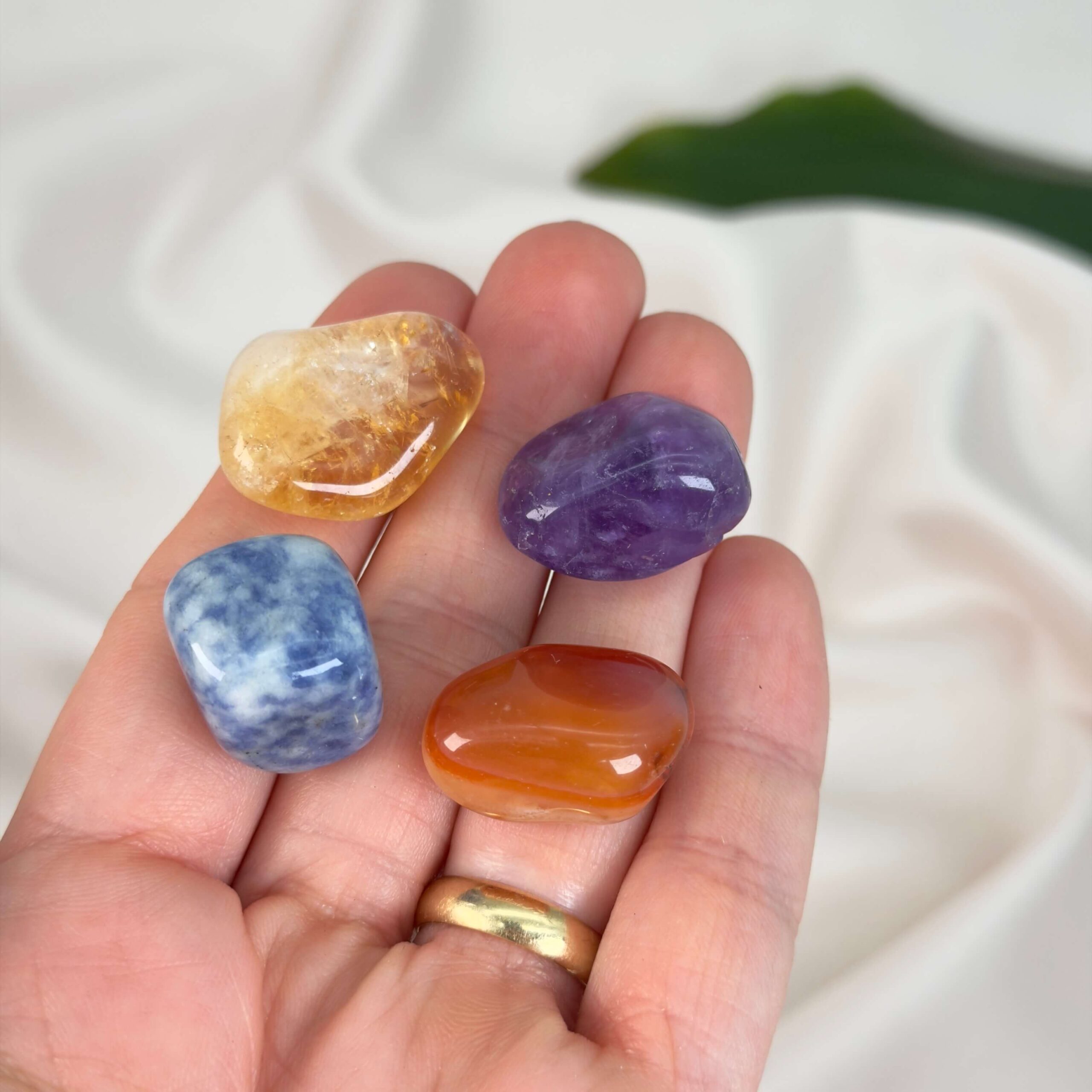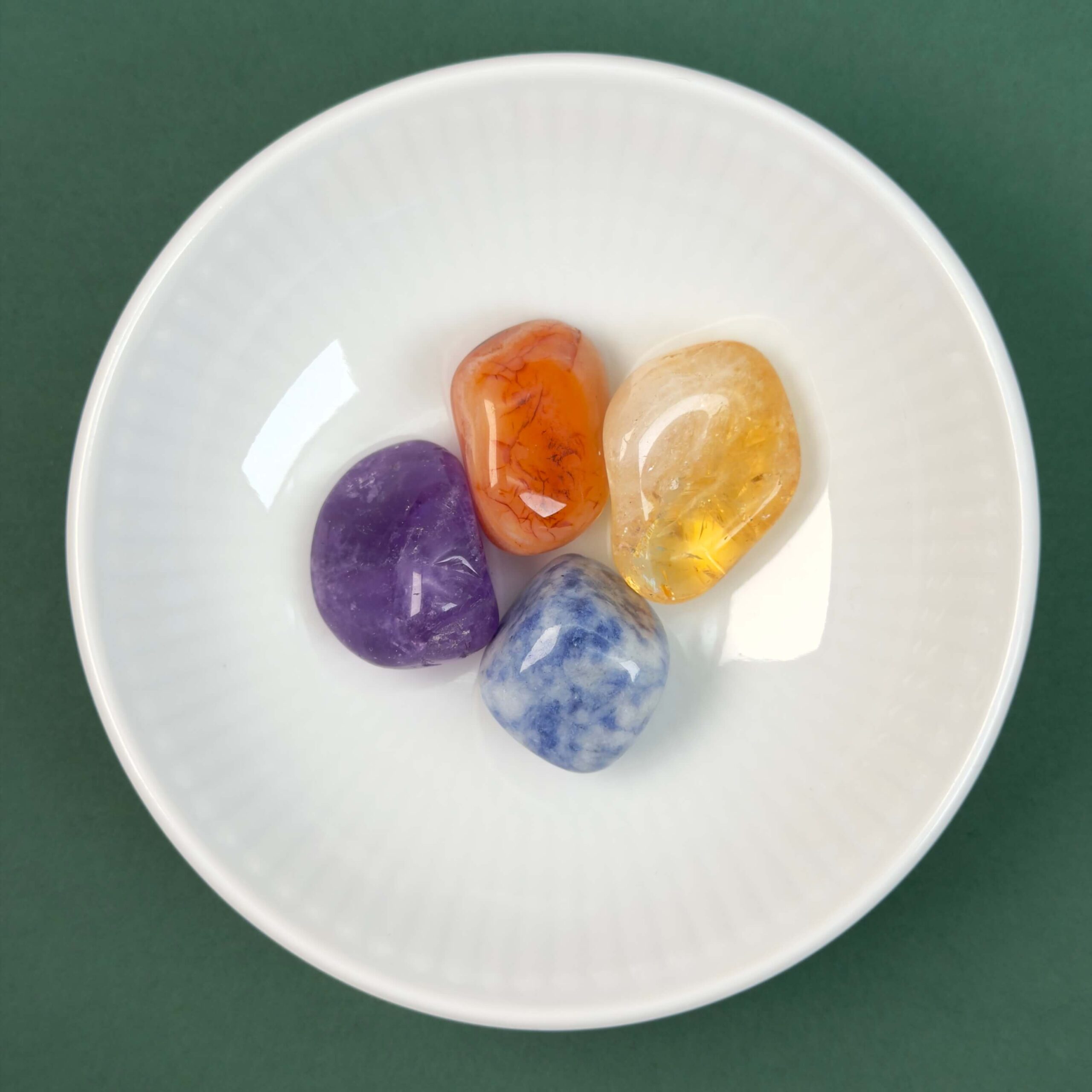 Ametyst og sodalit er ideelle til refleksion og klarhed, mens citrin og karneol støtter energi, glæde og handling.