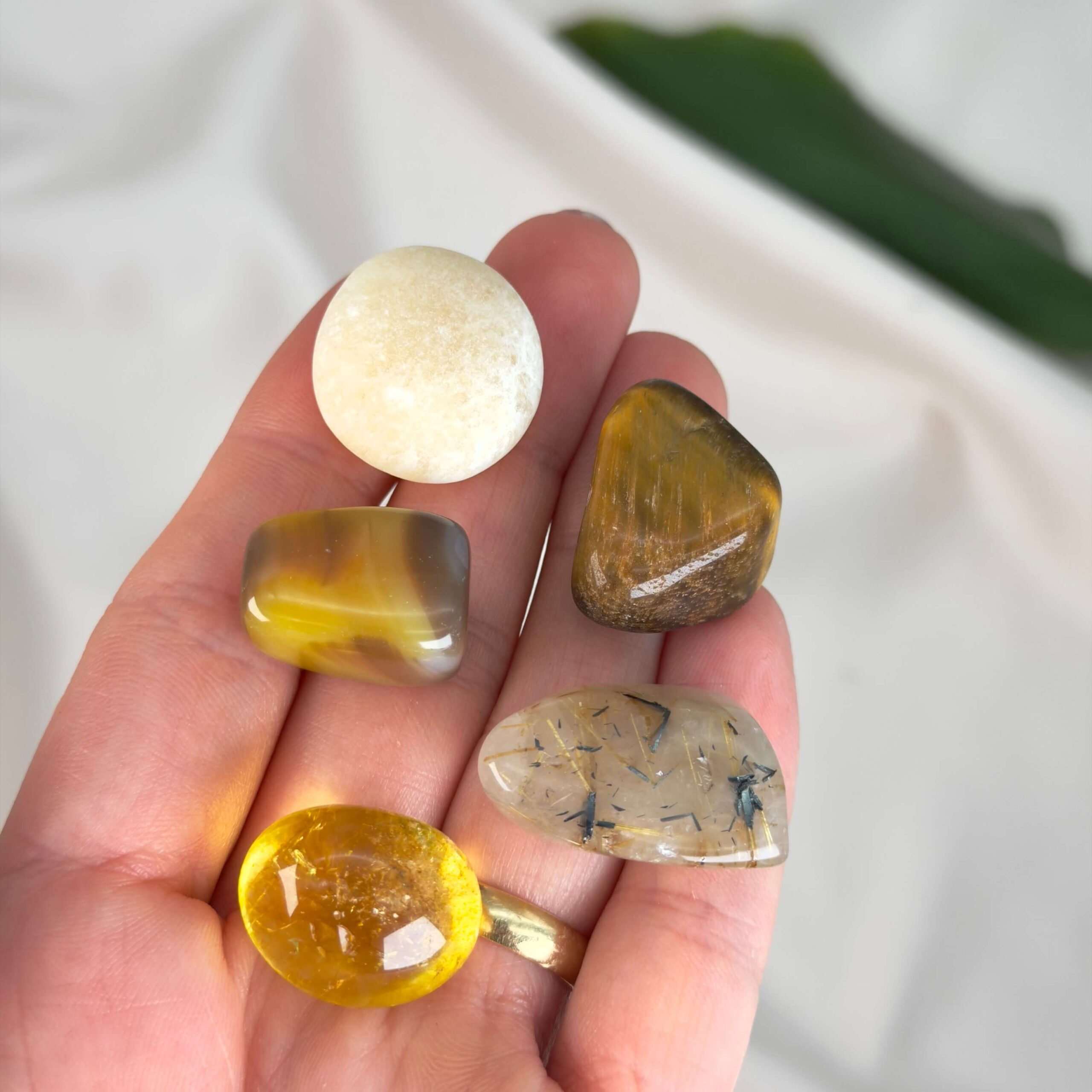 Citrin og gul calsit er ideelle til energi og motivation, mens tigerøje, mookaite og rutilkvarts støtter handlekraft og målrettethed.