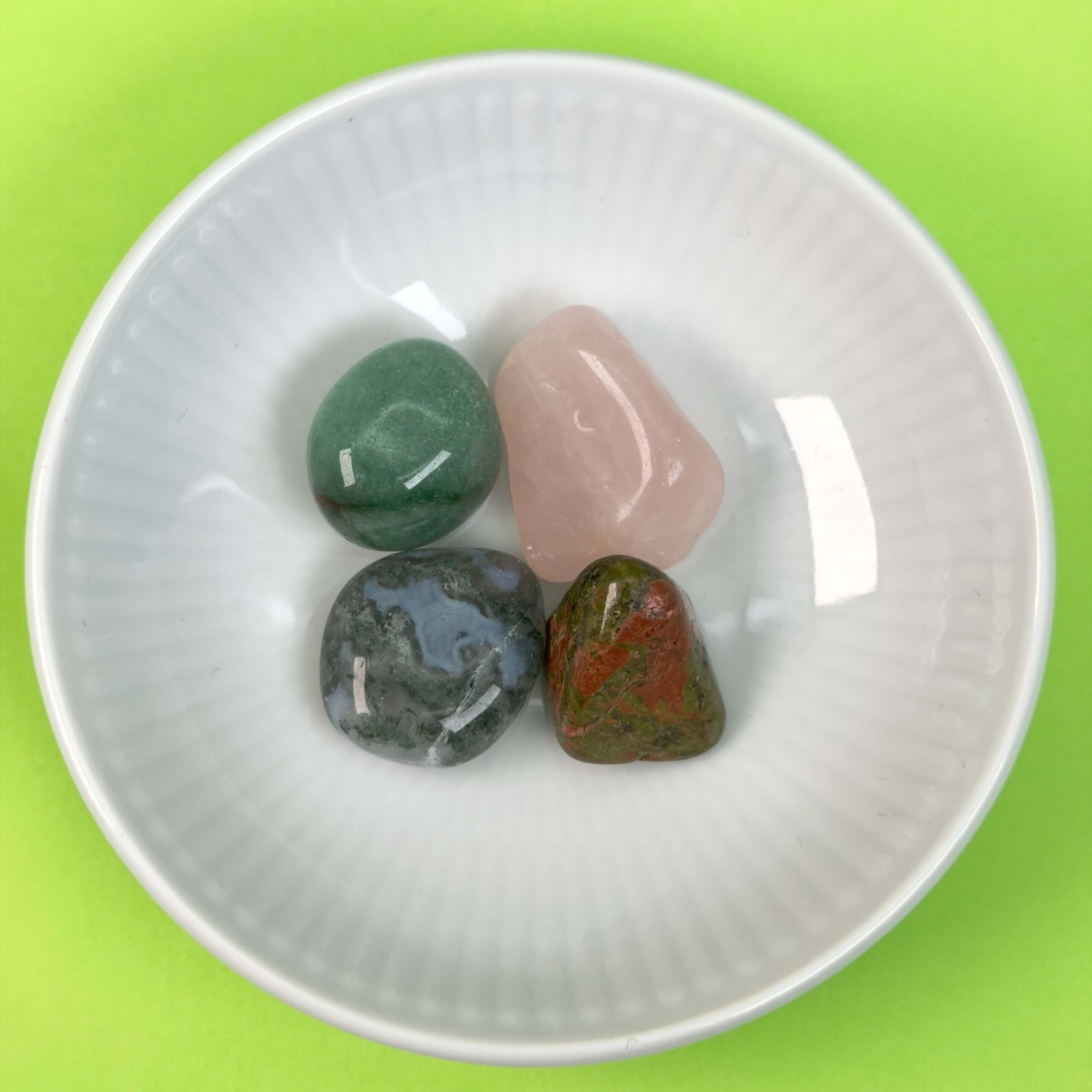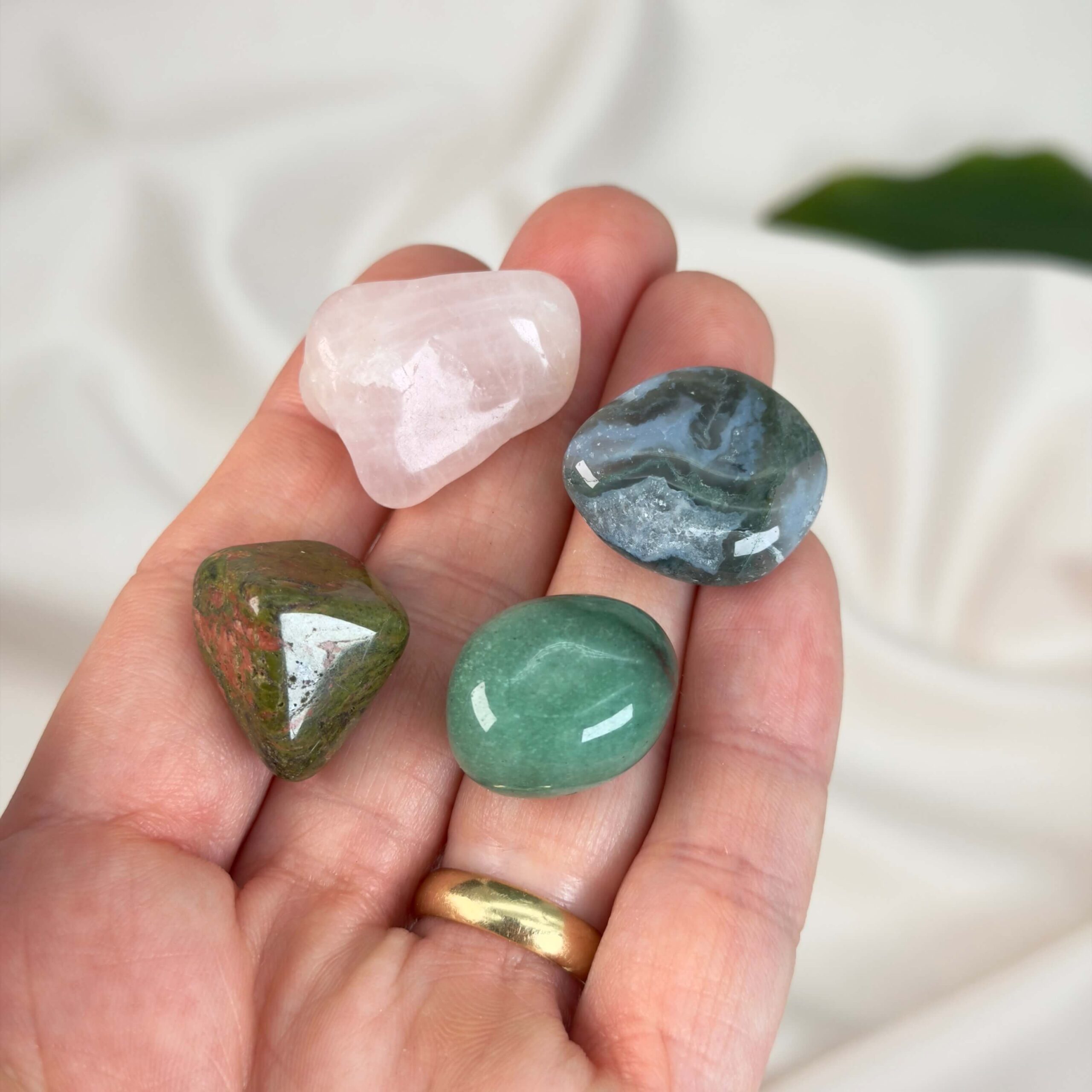 Grøn aventurin og rosakvarts er ideelle til ro og selvkærlighed, mens mos agat og unakit støtter stabilitet og udvikling.