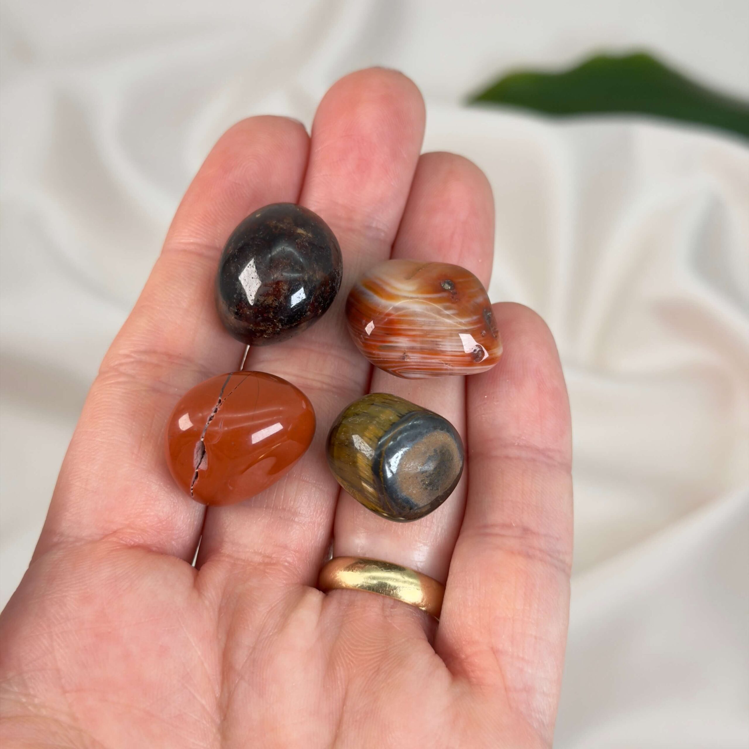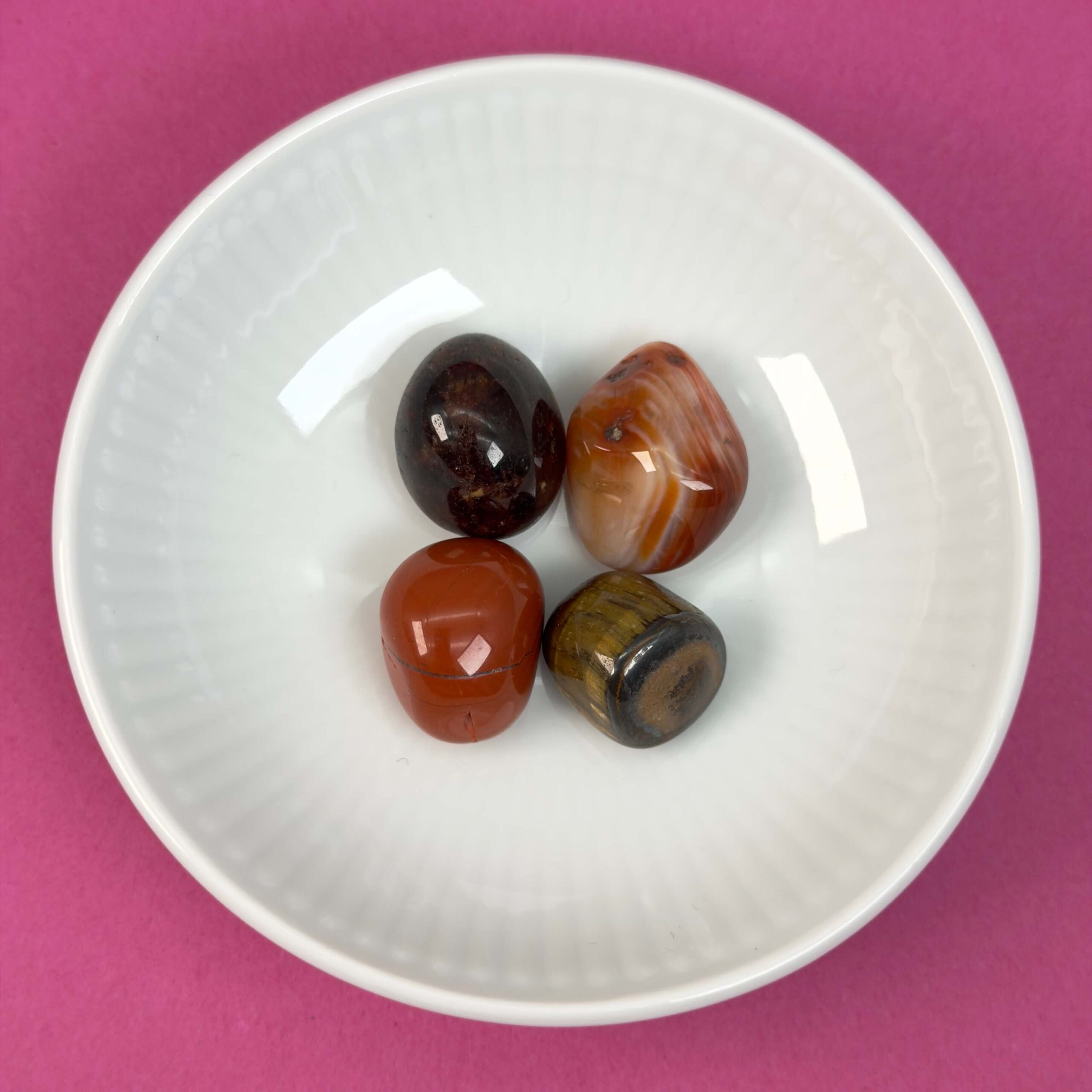 Granat og karneol er ideelle til energi og fremdrift, mens rød jaspis og tigerøje hjælper med fokus og stabilitet.