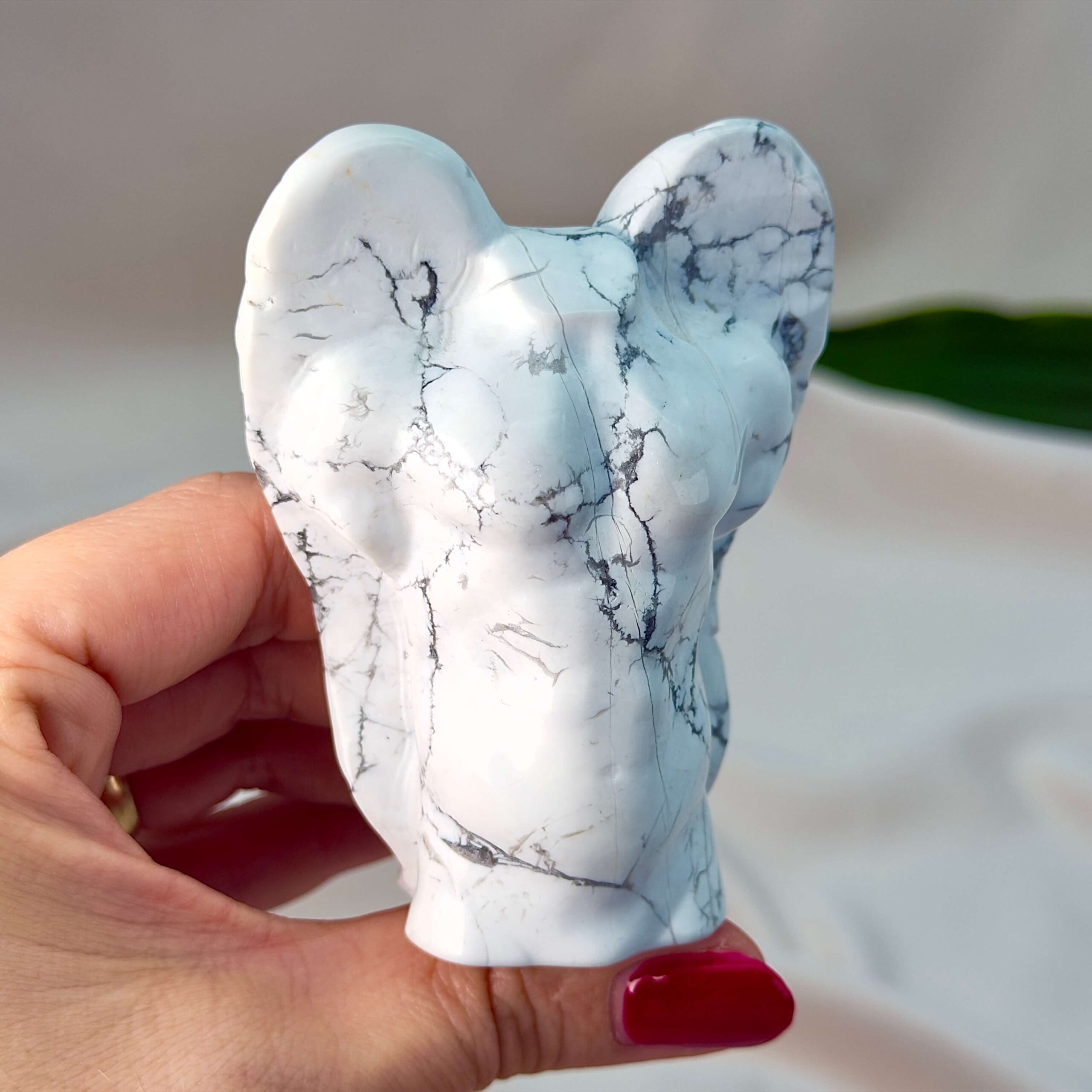 Howlit bruges også ofte som søvnsten. Den placeres gerne på natbordet eller under puden for at berolige sindet inden søvn og reducere tankemylder. Dens blide energi hjælper kroppen med at give slip og finde hvile. Som lommesten kan Howlit fungere som en påmindelse om at trække vejret dybt og vende tilbage til ro, når hverdagen bliver for intens. Howlit er stenen for dig, der ønsker mere indre fred, tålmodighed og klarhed. Den lærer dig, at styrke også kan være stille, og at ro er en aktiv tilstand, du kan vælge igen og igen. Dinne Howlit Mandekrop med vinger er i kategorien one-of-a-kind, hvilket vil sige, at det er figuren på billedet du køber. Prisen er for den éne figur. Figuren måler 8 cm og vejer 201g.