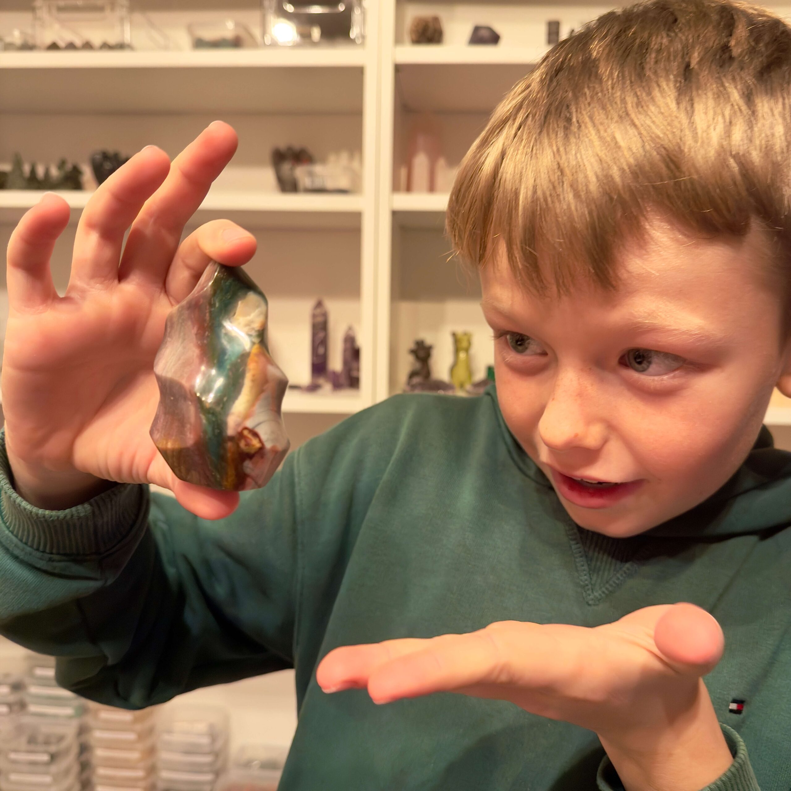En freeform krystal er helt særlig, fordi den formes efter stenens naturlige linjer i stedet for faste skabeloner. Den slibes blidt, men uden at tvinges i en bestemt retning, så dens naturlige udtryk, farvespil og bevægelse får lov at stå frem. Formen føles organisk, blød og levende, som om stenen viser sin sande karakter.