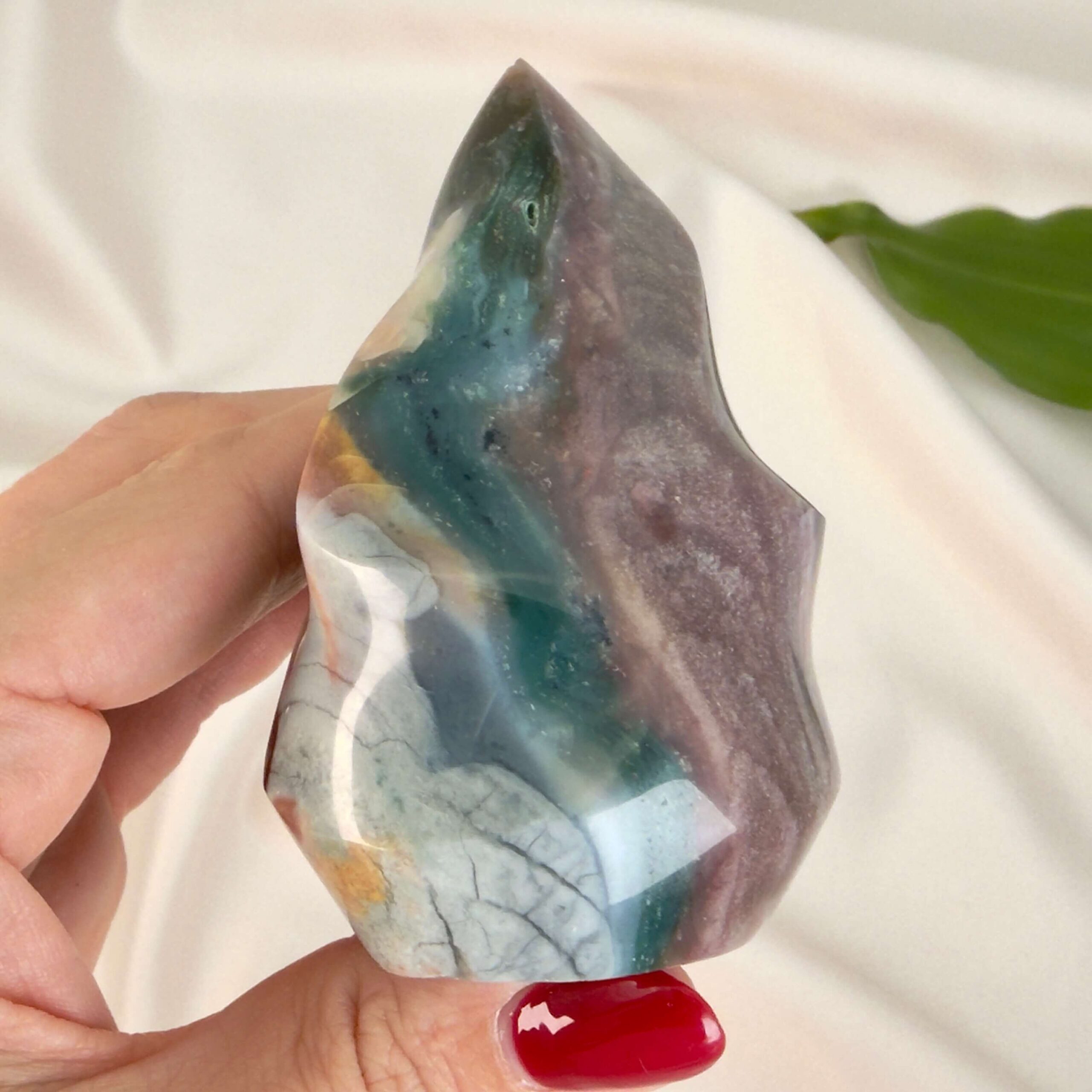 Jaspis Polychrom er også en sten for livsglæde, kreativitet og vitalitet. Dens farver repræsenterer naturens elementer: ild, jord, vand og luft. Derfor er den et ideelt valg for dig, der ønsker balance mellem aktivitet og hvile, passion og ro, styrke og blødhed. Den minder dig om, at du kan gå nye veje, tage modige beslutninger og stadig være trygt forankret i dig selv. Denne Jaspis Polychrom freeform er nøje udvalgt af Markus og er derfor i kategorien one-of-a-kind, det vil sige at det er krystallen på billederne du køber. Prisen er for den éne krystal. Freeformen måler 8 cm i højden og vejer 175g.På lager