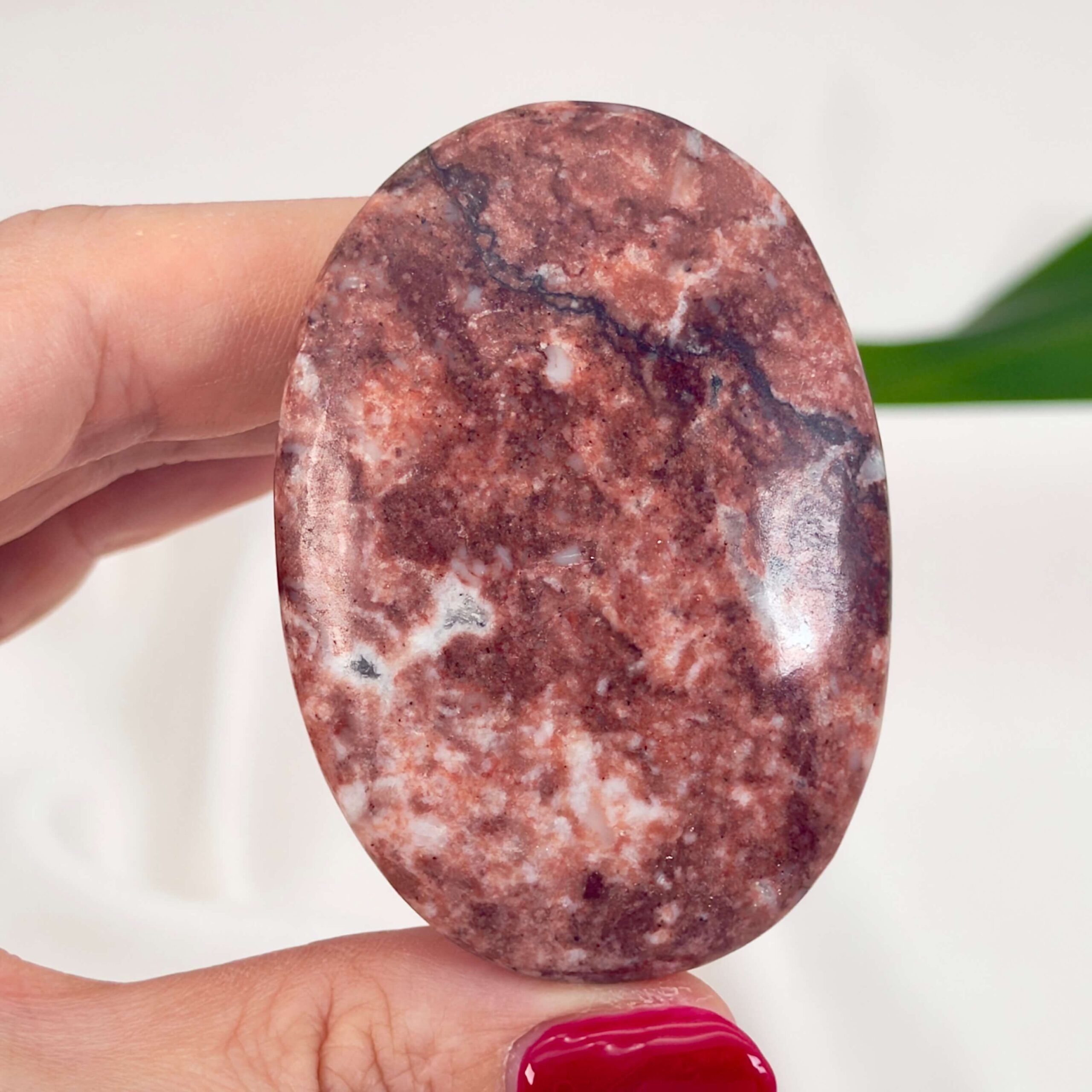Kærlighed: En Jordbær Calsit håndsten åbner hjertet og støtter både selvkærlighed og følelsesmæssig healing.