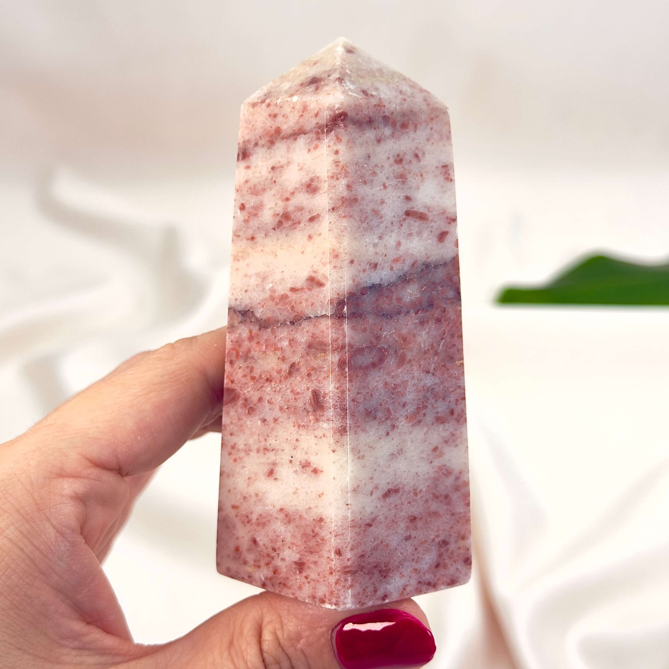 Kærlighed: Et Jordbær Calsit Tårn åbner hjertet og støtter både selvkærlighed og følelsesmæssig healing.