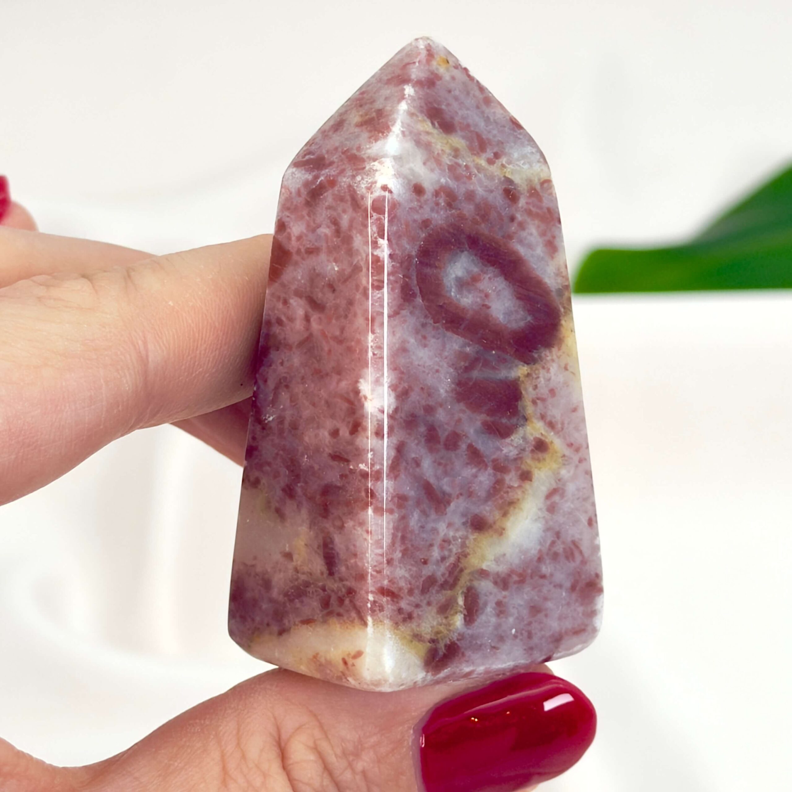 Kærlighed: Et Jordbær Calsit Tårn åbner hjertet og støtter både selvkærlighed og følelsesmæssig healing.