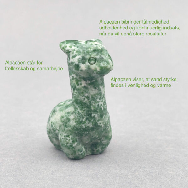 En alpaca i Jade Nephrit kan give ro, afhjælpe negativ energi og skabe forbindelse til naturen.