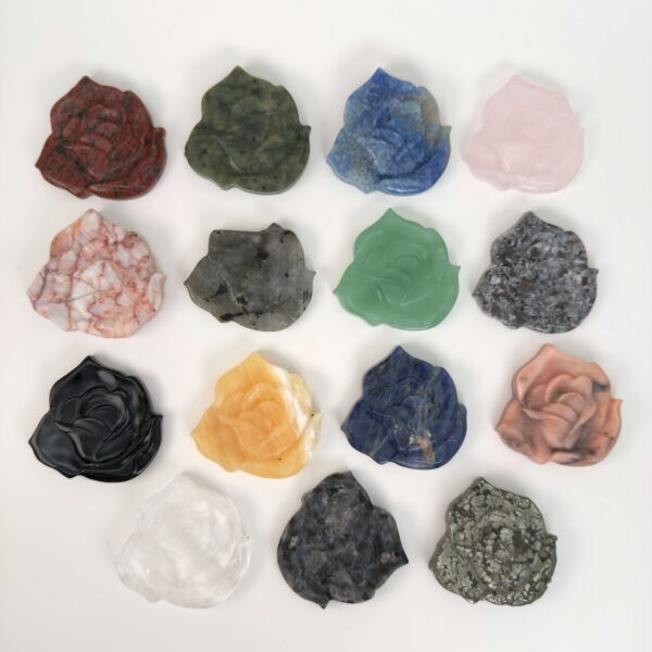 En krystal blomst er en udskåret figur formet som en blomst, hvor krystallens naturlige farver og struktur fremhæves i et blødt og harmonisk design.