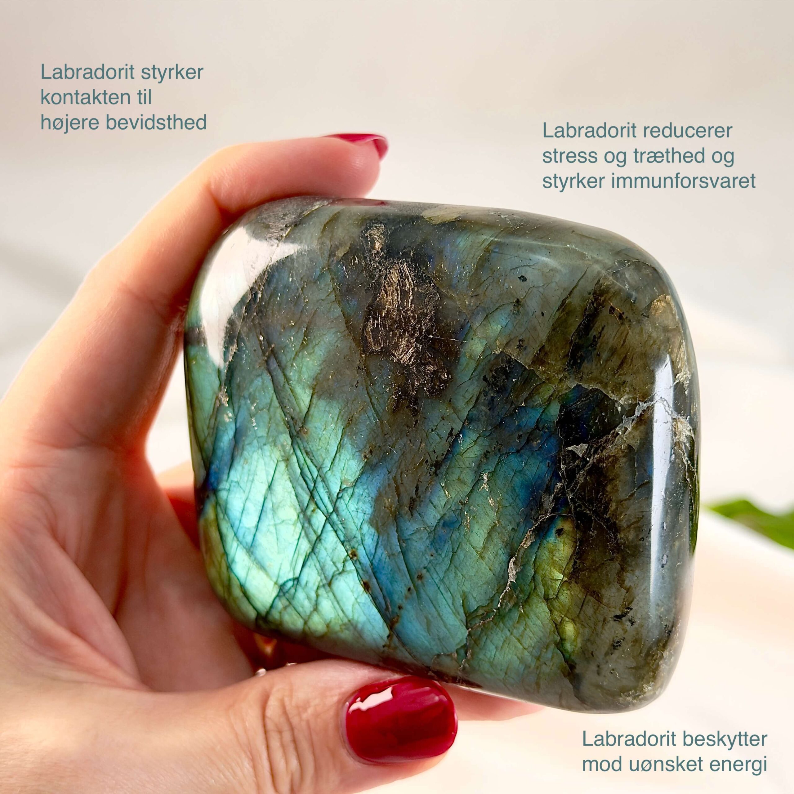 Labradorit er en sten der beskytter mod negativ energi, samtidig med at den styrker intuition, klarsyn og spirituel udvikling. Energetisk fungerer Labradorit som et skjold. Den hjælper med at absorbere og omdirigere energier, så du ikke tager andres følelser og stemninger ind på en måde, der dræner dig. Det gør den til en værdifuld sten for særligt sensitive mennesker, som ofte føler sig påvirket af omgivelsernes energi. Labradorit er også en sten, der fremmer styrke og selvtillid, så du tør stå fast i din egen energi.