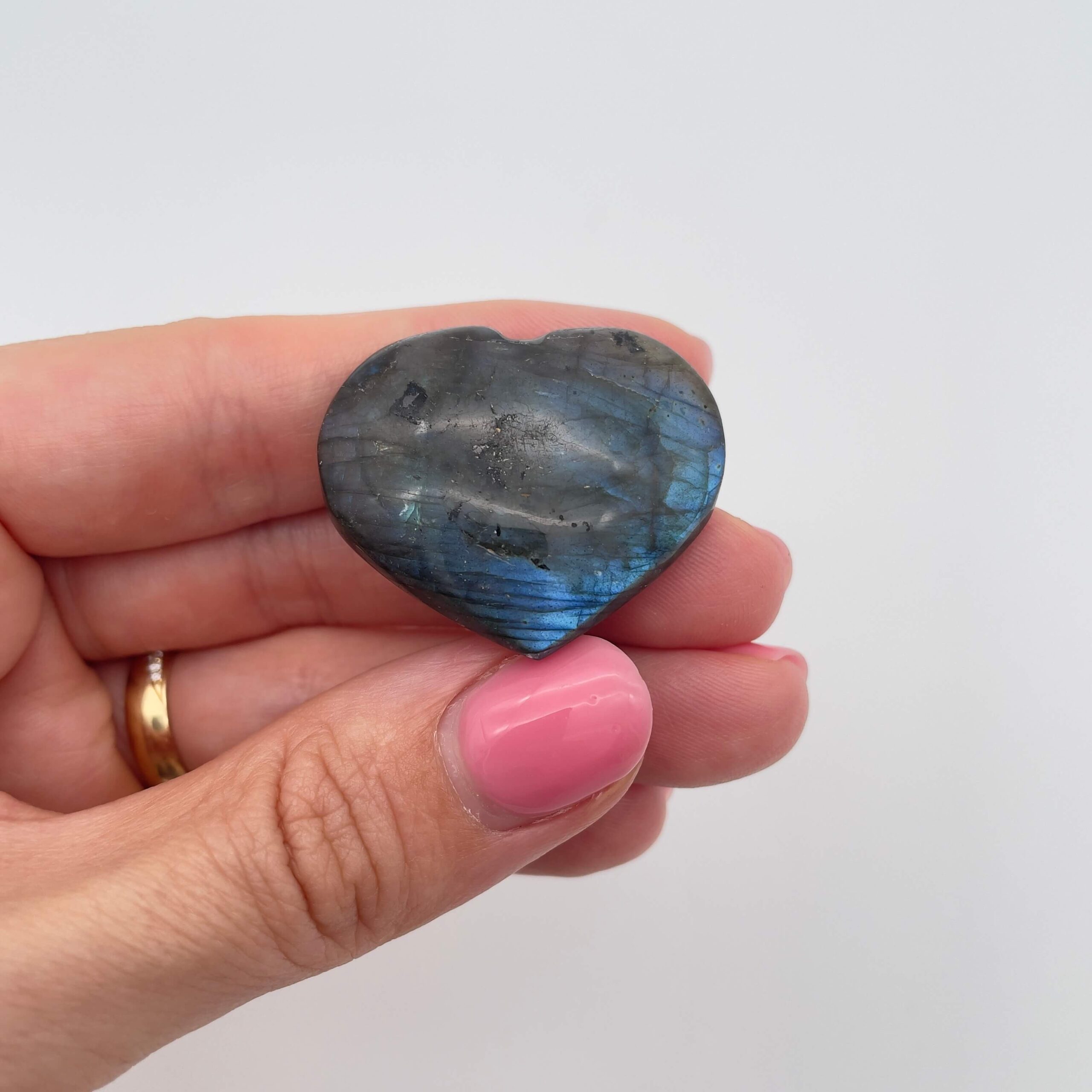 Denne fine Labradorit er en krystal, der næsten virker magisk ved første øjekast. Dens mørke grundfarve i grå og sort brydes af intense, iriserende farvespil i blå, grøn, guld og undertiden lilla. Dette lysfænomen kaldes labradorescens og giver stenen et levende udtryk, som har gjort den kendt som både en beskyttelsessten og en sten for transformation. Labradorit er en sten der beskytter mod negativ energi, samtidig med at den styrker intuition, klarsyn og spirituel udvikling. Energetisk fungerer Labradorit som et skjold. Den hjælper med at absorbere og omdirigere energier, så du ikke tager andres følelser og stemninger ind på en måde, der dræner dig. Det gør den til en værdifuld sten for særligt sensitive mennesker, som ofte føler sig påvirket af omgivelsernes energi. Labradorit er også en sten, der fremmer styrke og selvtillid, så du tør stå fast i din egen energi. Labradorit hjerter sælges uspecificeret Prisen er for én Vælg mellem flere størrelser