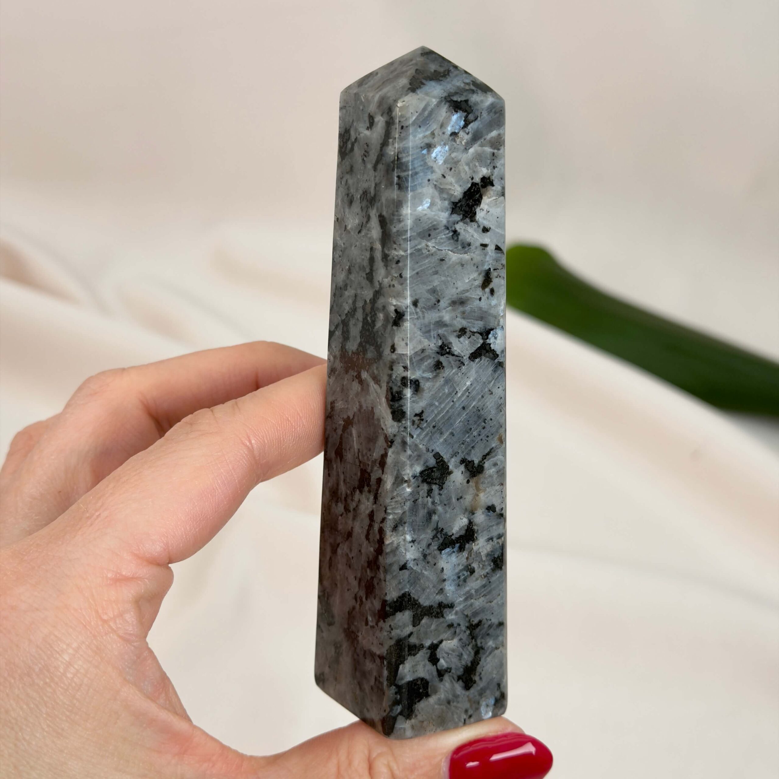Et Larvikit Tårn arbejder med jording, beskyttelse og indre visdom. Stenen har en dyb, mystisk energi der forbinder dig med jordens ældgamle kraft. Den støtter dig i at se bag overfladen og forstå skjulte sandheder. Larvikit minder dig om, at sand visdom kommer fra stilhed og observation.