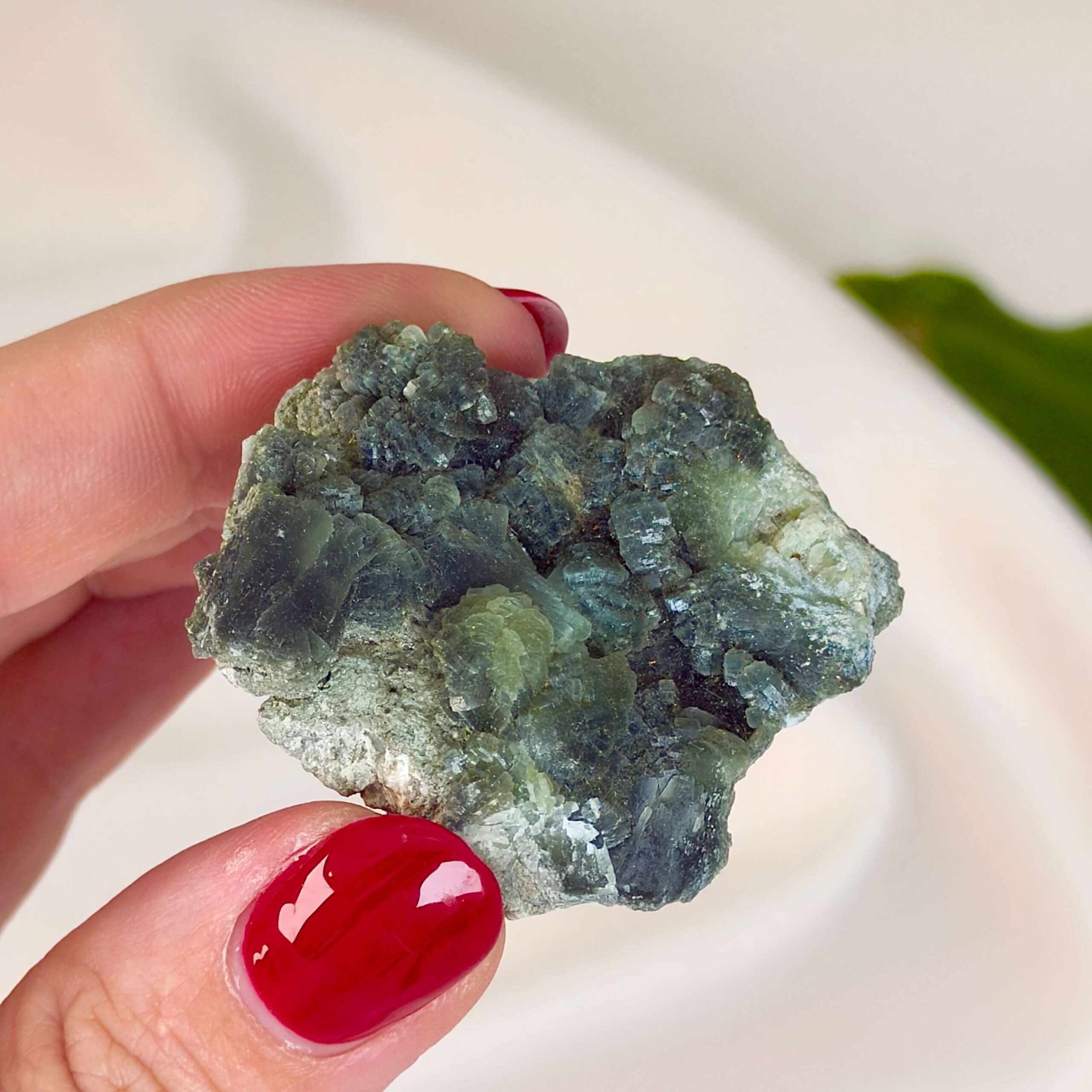 Prehnit rå har en stærkere, mere jordnær energi end den polerede variant. Overfladen er naturlig, mat og ofte med små strukturer, der viser krystallens oprindelige form. Rå Prehnit føles mere grounding og forankrende, og den arbejder dybt med hjertet, intuitionen og følelsen af indre stabilitet. Den rå sten er ideel til meditation, manifestation, energiarbejde og som energipunkt i hjemmet.