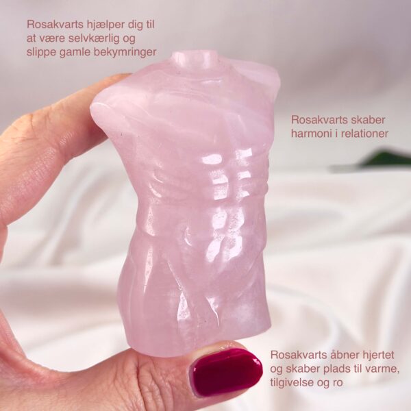 En Rosakvarts mandekrop udsender en blid, men konstant vibration af kærlighed. Den opløfter energien i et rum og skaber harmoni i relationer. Den hjælper med at genoprette tillid og styrker evnen til at tilgive både dig selv og andre. Rosakvarts mandekrop fremmer empati og forståelse, og den minder os om, at kærlighedens styrke ofte ligger i stilhed.