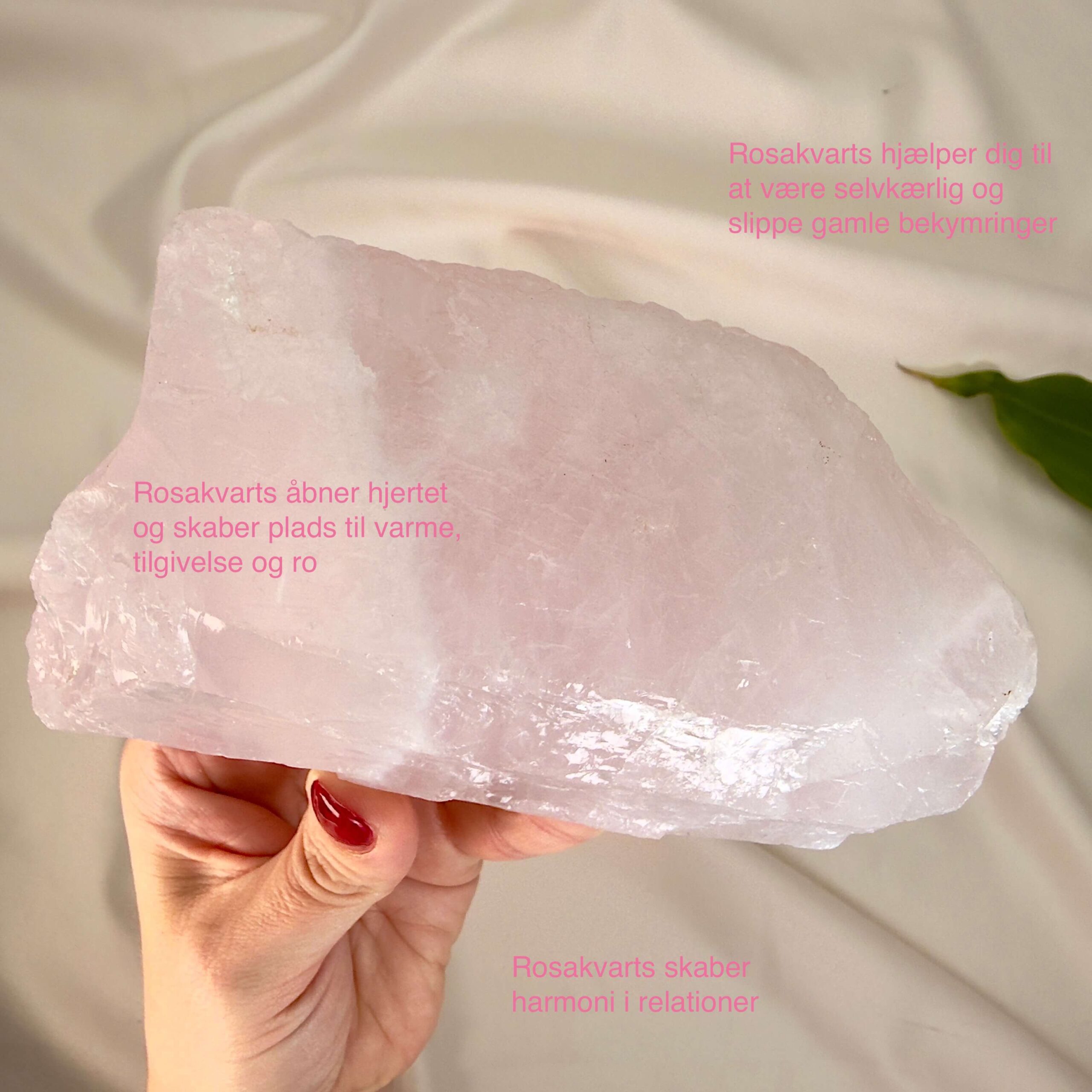 Rosakvarts er kærlighedens sten. Den åbner hjertet, blødgør sindet og skaber plads til varme, tilgivelse og ro. Dens milde, rosa nuance udstråler fred og tryghed. Rosakvarts kaldes ofte hjertets healer, fordi den forbinder os med den dybeste form for kærlighed, både den vi giver, og den vi modtager.