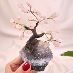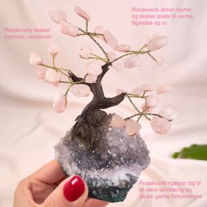 Rosakvarts træ udsender en blid, men konstant vibration af kærlighed. Den opløfter energien i et rum og skaber harmoni i relationer. Den hjælper med at genoprette tillid og styrker evnen til at tilgive både dig selv og andre. Krystallen fremmer empati og forståelse, og den minder os om, at kærlighedens styrke ofte ligger i stilhed.
