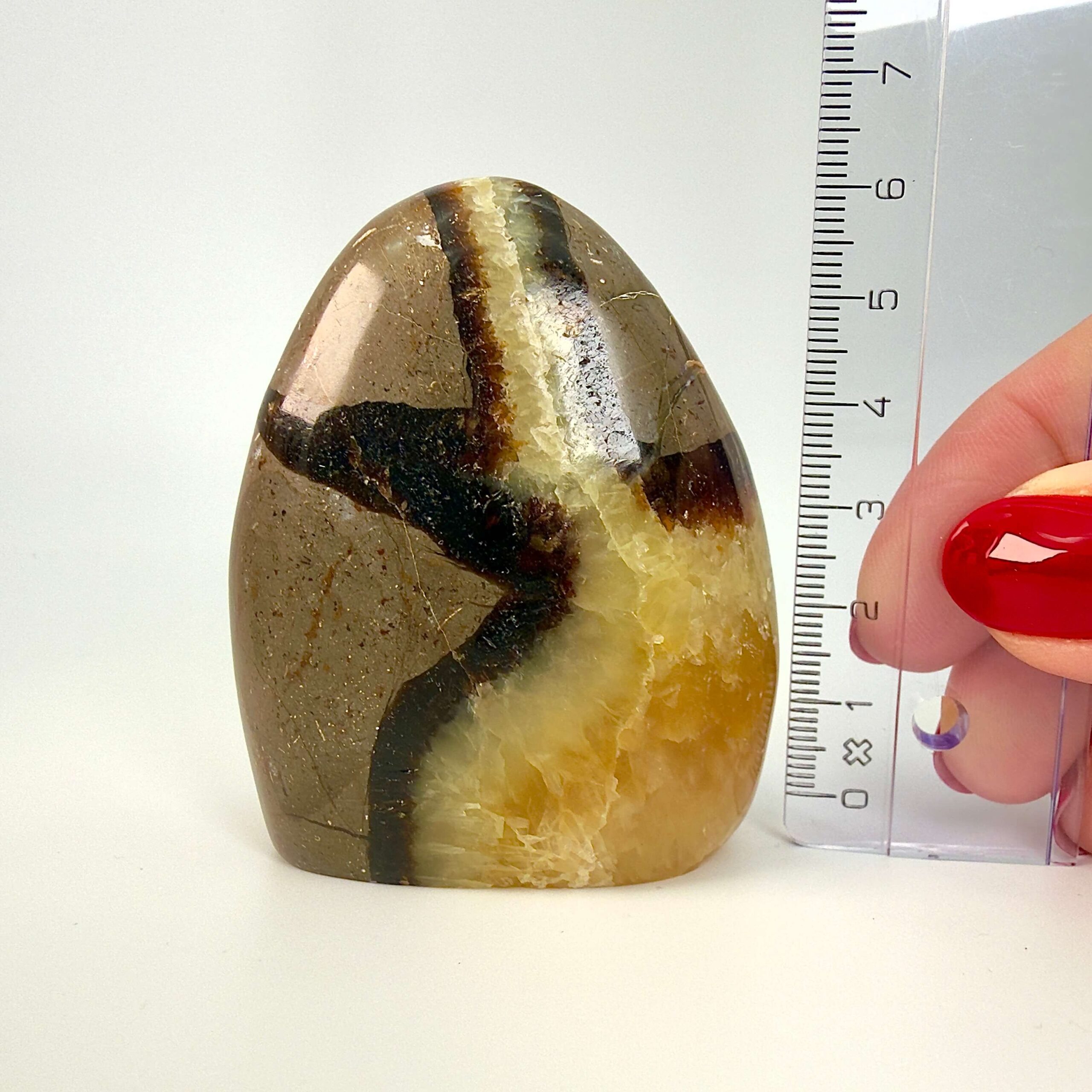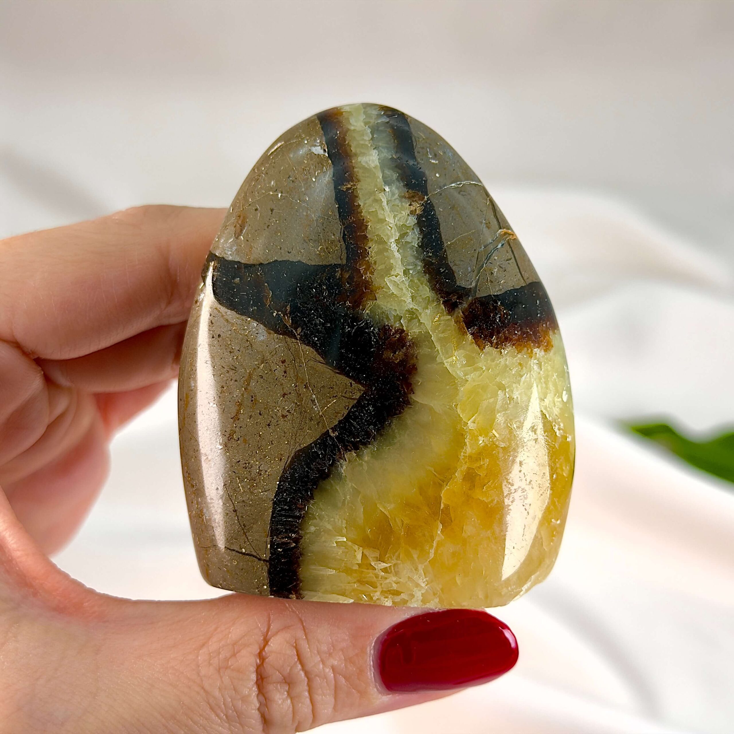 Septarie er kendt for sine særlige mønstre, hvor brune, gule og grå felter smelter sammen i smukke naturlige former, næsten som om krystallen bærer jordens historie indeni.