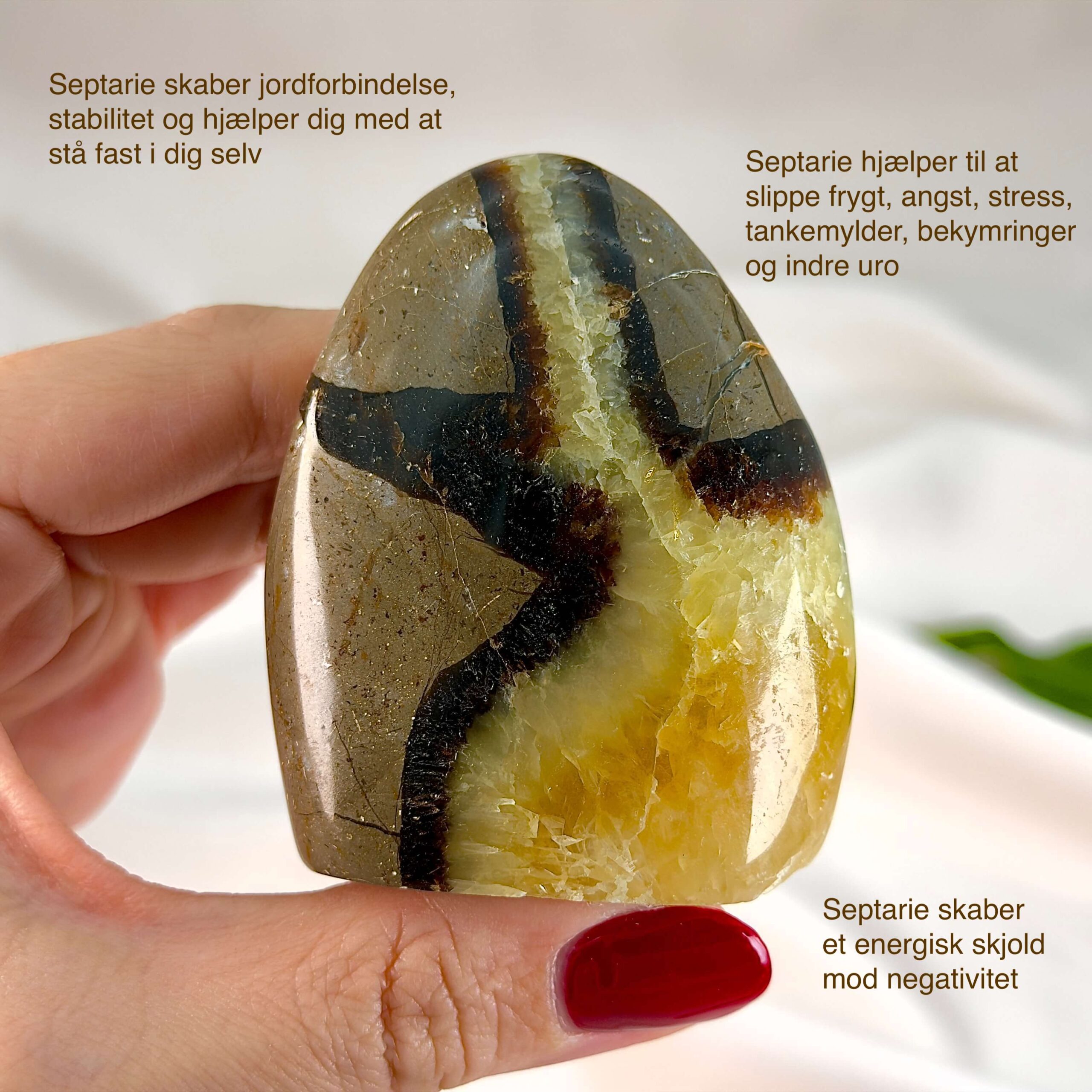 Denne smukke Septarie Freeform er en kraftfuld krystal, som forener jordens energi med indre styrke og indsigt. Septarie hjælper med grounding, stabilitet og selvindsigt og skaber balance både i krop og sind. Den kan give dig mod til at stå stærkt i dig selv. Septarie er en god sten mod angst, stress, tankemylder og bekymringer, da den hjælper til at slippe frygt og uro og giver en følelse af indre ro. Samtidig er det også en god krystal til at fremme forståelse i relationer.