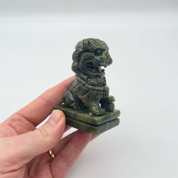 Når den er skåret i Serpentin, kombinerer figuren løvens beskyttelsesenergi med krystallens egenskaber.