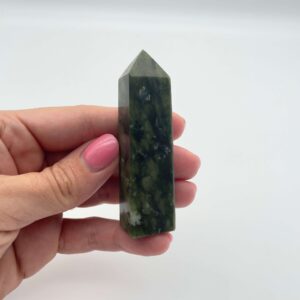 Serpentin er en smuk, jordnær krystal, der varierer i grønne nuancer fra lys olivengrøn til dybere, mørkere toner. Navnet kommer fra det latinske serpens, som betyder slange, fordi stenen ofte har mønstre, der minder om slangens skæl. Allerede når man ser på Serpentin, fornemmer man dens tætte forbindelse til naturen, jorden og livets oprindelige kræfter. Serpentin er en krystal, der bringer ro, balance og jordforbindelse. Den er kendt for at stabilisere sindet, opløse følelsesmæssig uro og skabe en følelse af indre harmoni. Det føles som at få energien "groundet", når man holder stenen i hånden, som at slippe uro og finde tilbage til en rodfæstet tilstand. Denne Serpentin obelisk er i kategorien One-Of-A-Kind, som betyder at det er obelisken på billedet du køber. Prisen er for den éne.