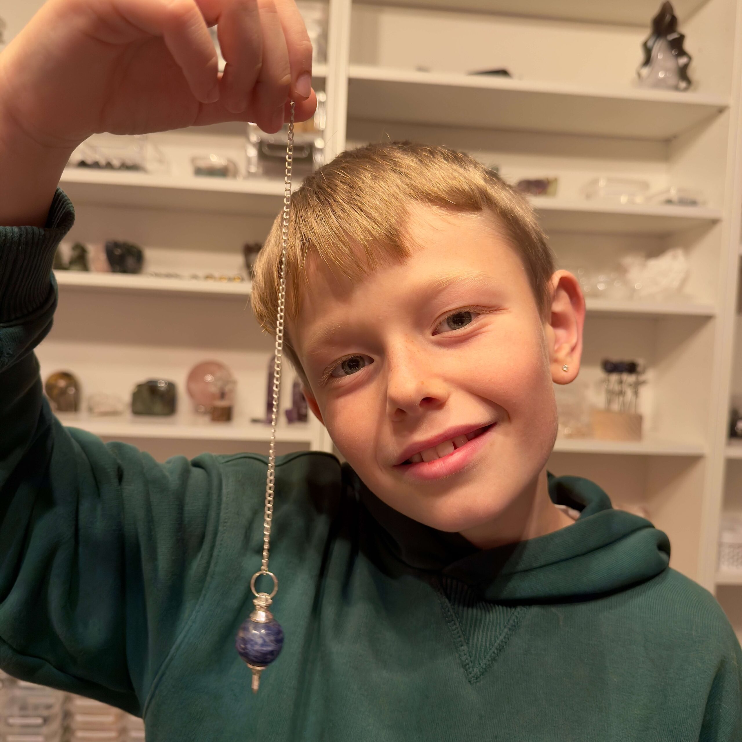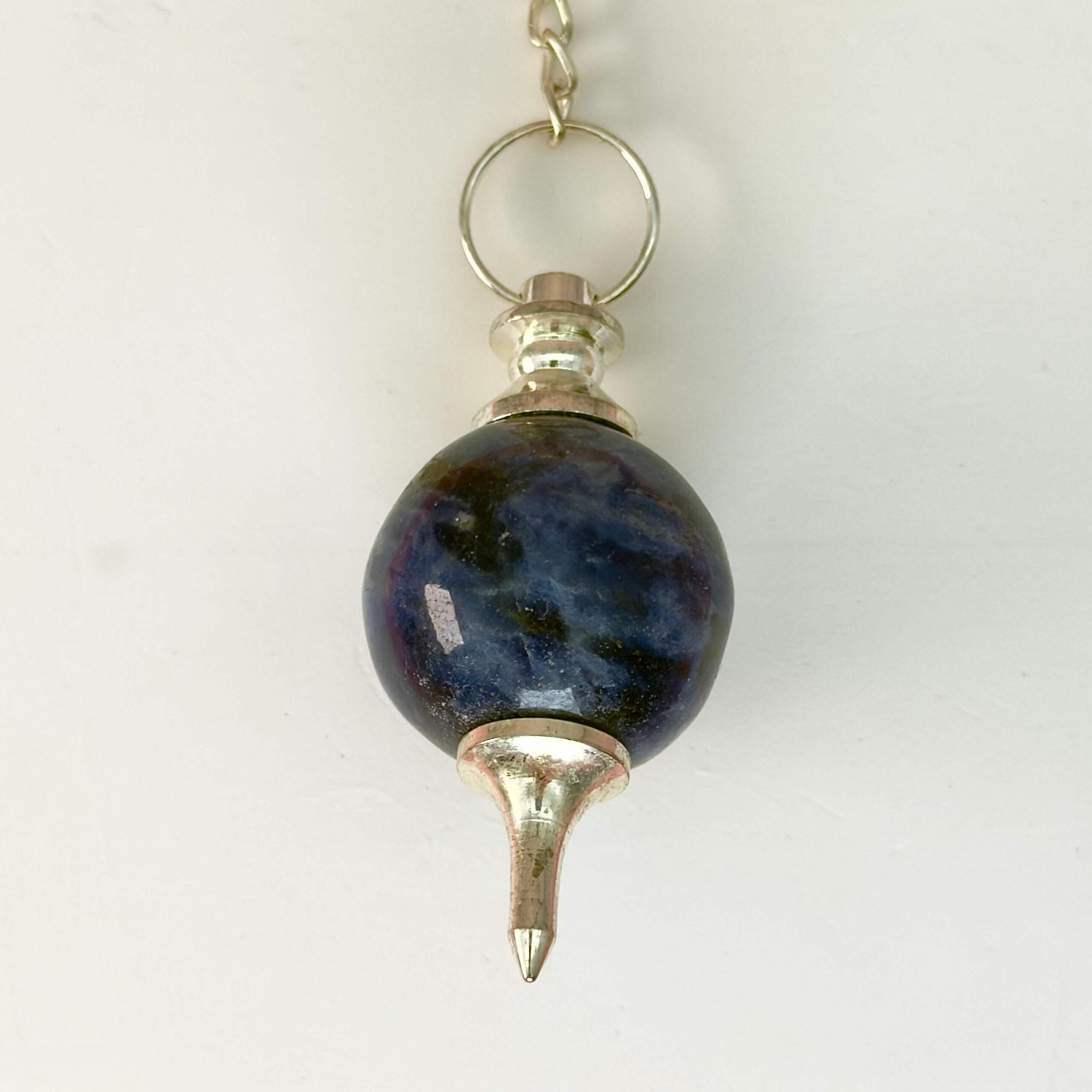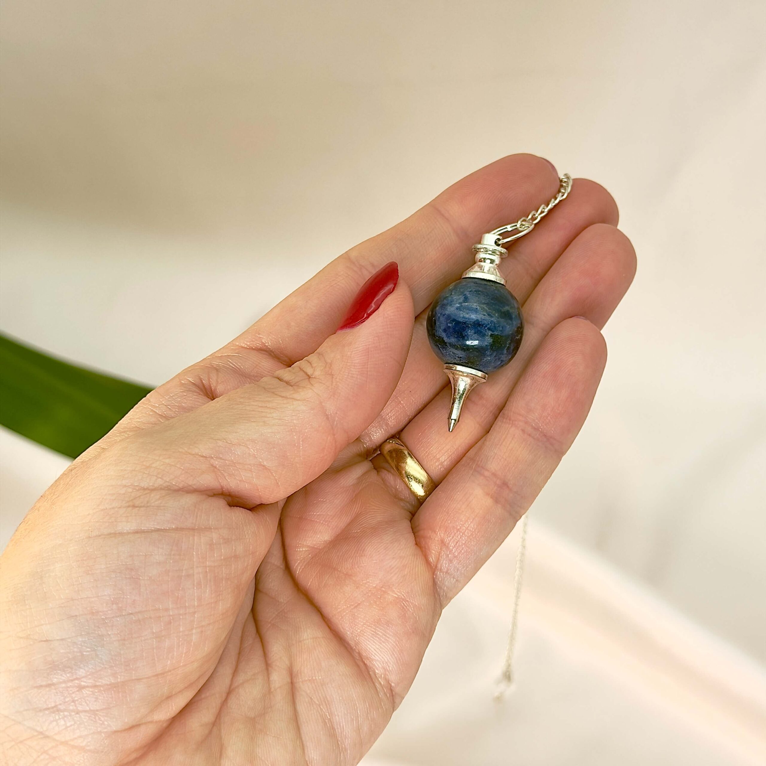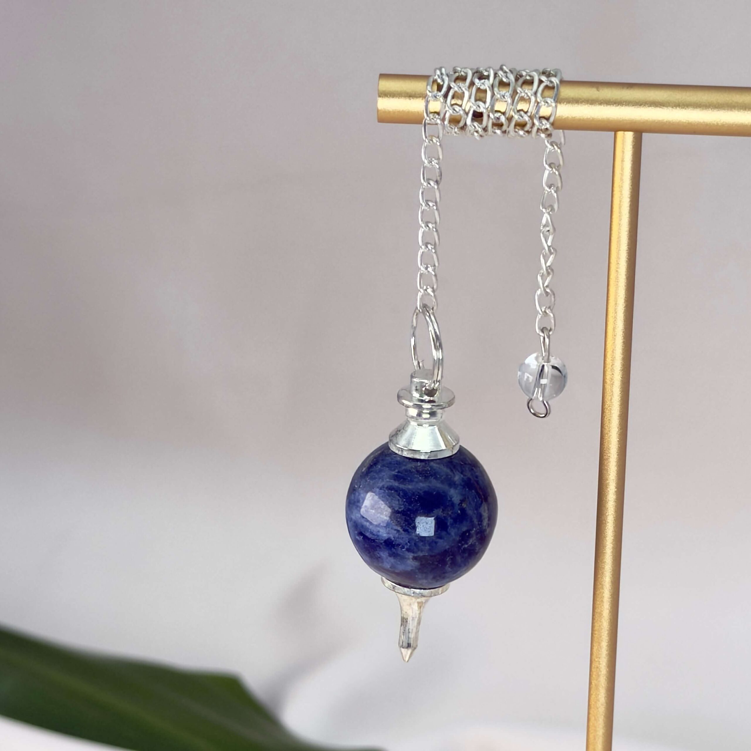 Et Sodalit pendul er en dybblå og beroligende krystal, der gennem årtier har været elsket for sin evne til at bringe mental klarhed, styrke intuitionen og skabe ro i sindet. Når du holder en sodalit i hånden, mærker du straks en stabiliserende energi, som hjælper tanker og følelser med at falde på plads. Den blå farve, ofte krydret med hvide årer af calcit, giver stenen et udtryk af dyb visdom og stille styrke. Sodalit er kendt for at støtte ærlig kommunikation, indre forståelse og modet til at stå ved sig selv, især når livet stiller krav om tydelighed eller refleksion.