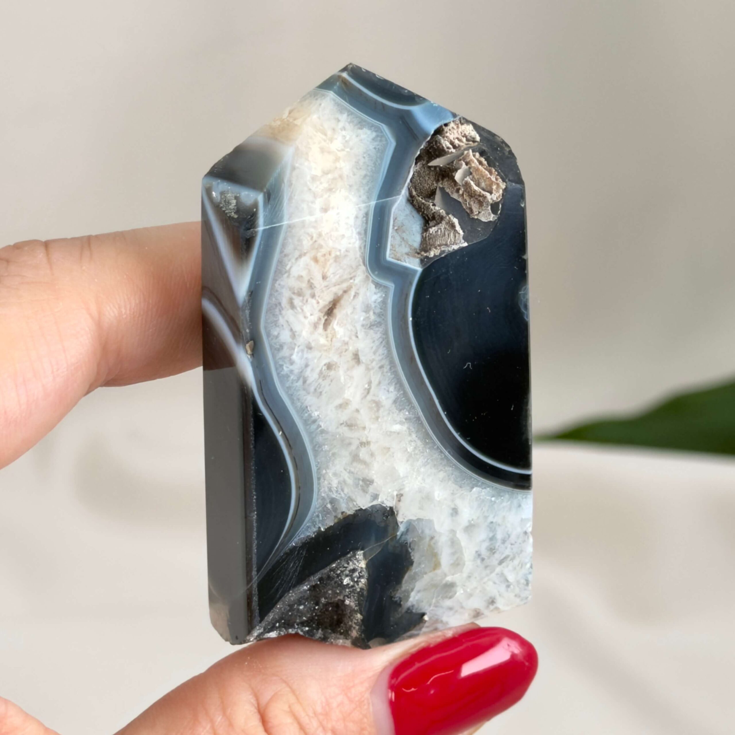 Denne Sort Agat er udformet som et tårn. Det specielle ved netop denne form er, at den spidse top leder energien opad eller ud i det rum, hvor den står. Den er god at placere i hjemmet eller på et alter for at rense og stabilisere energien i rummet.