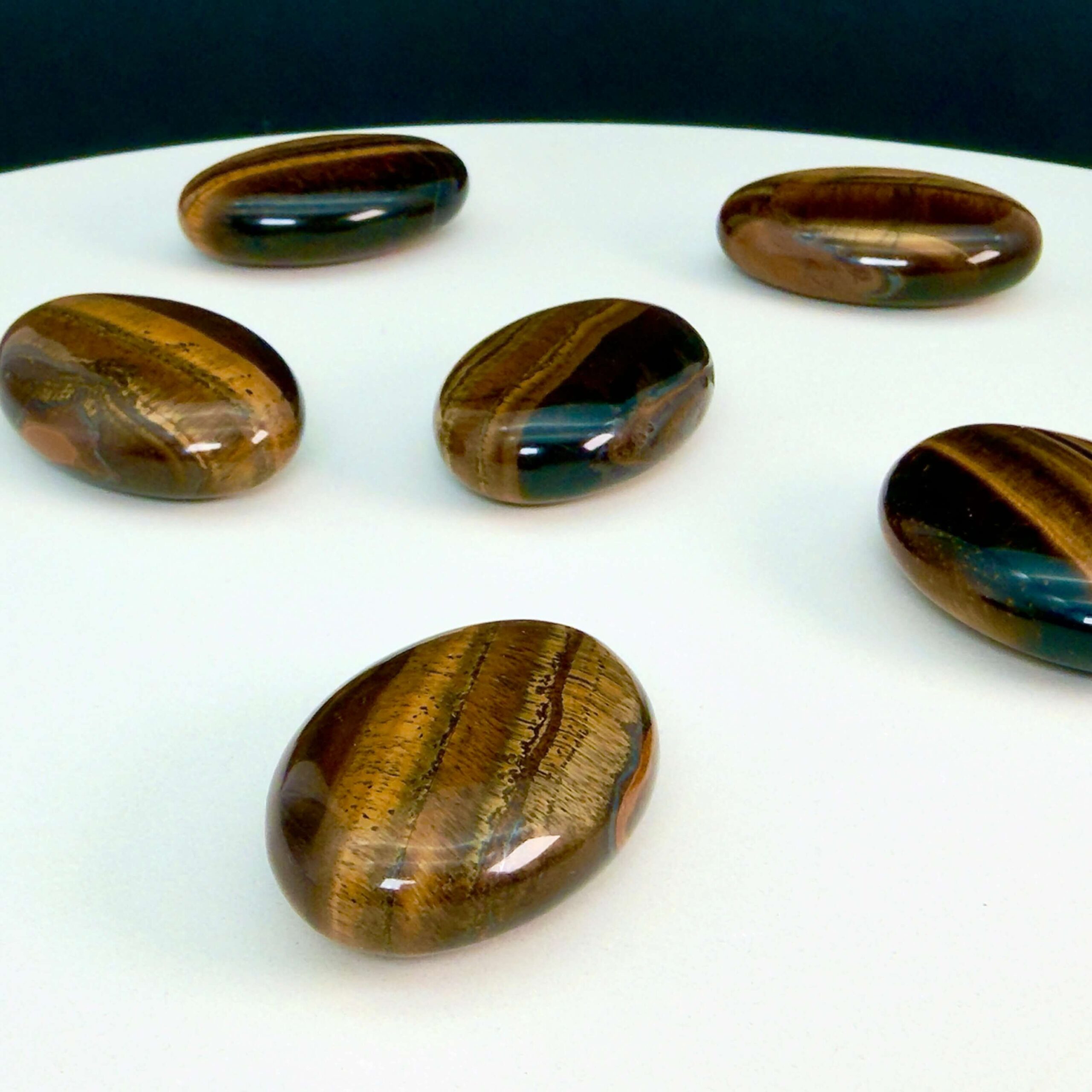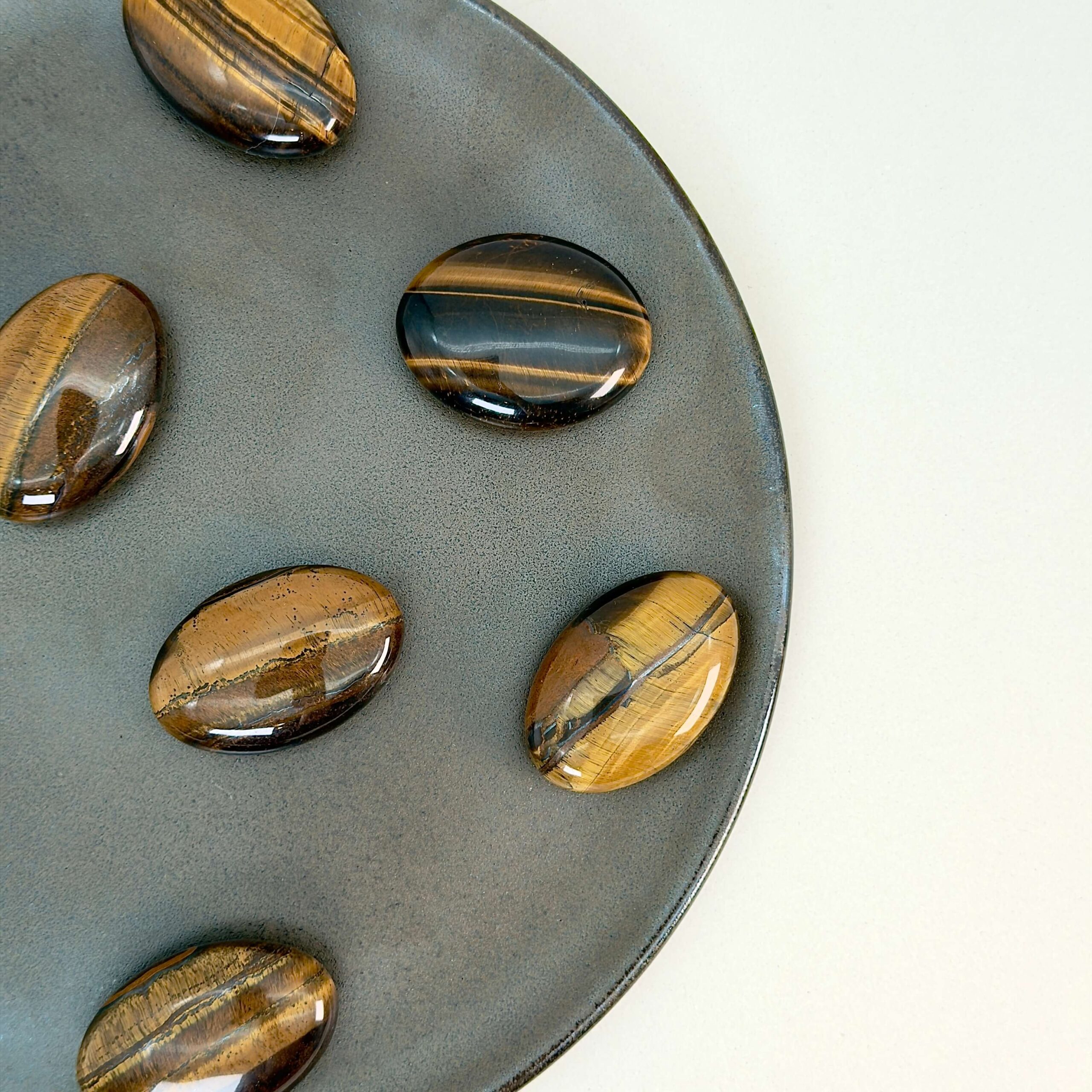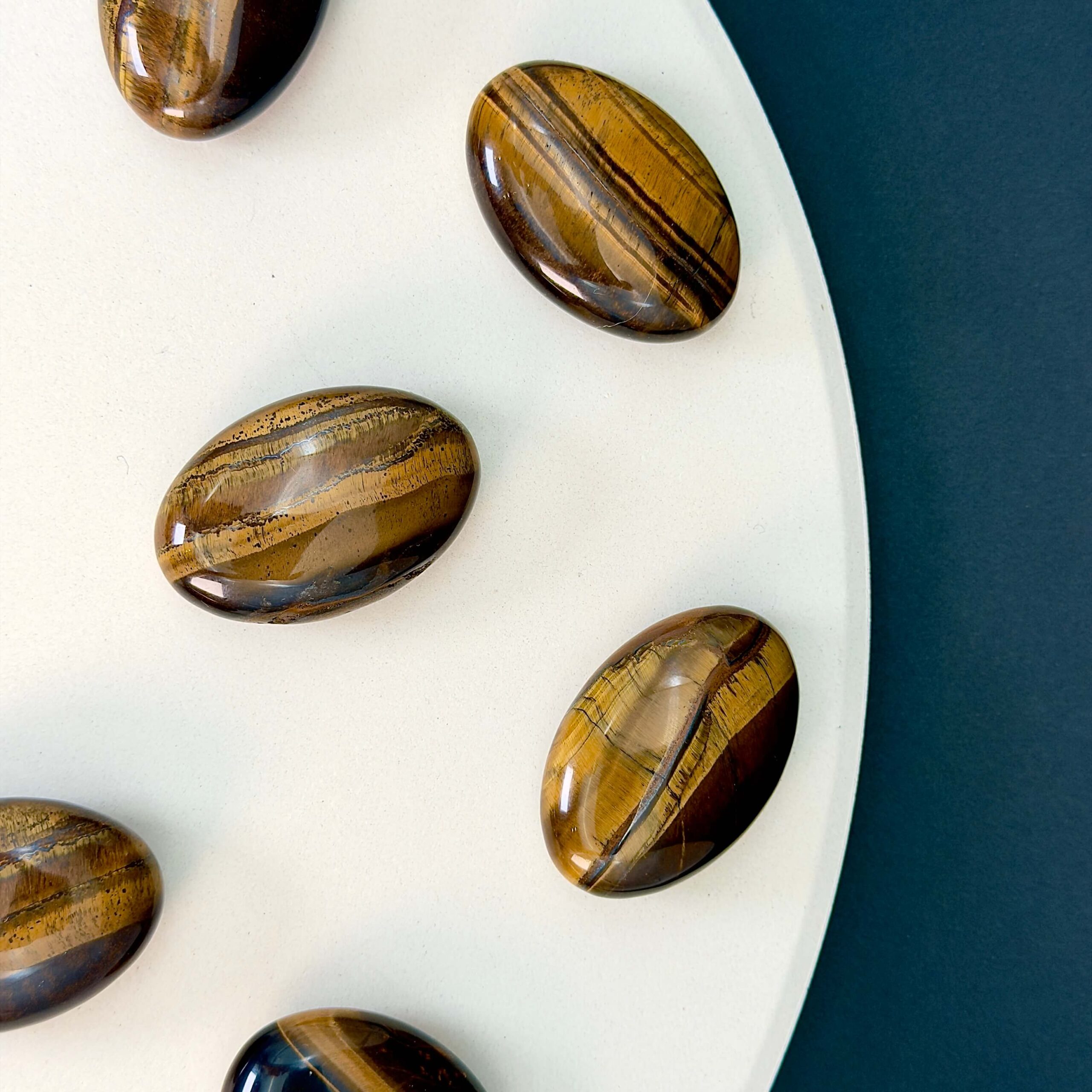 Tigerøje håndsten er en varm og kraftfuld krystal, der skinner i gyldne, brune og gyldensorte striber, som glimter i lyset, når stenen bevæges. Dens karakteristiske “katteøje-effekt”, også kendt som chatoyance, får det til at ligne, at stenen har et levende lys i sig. Denne særlige glød symboliserer klarhed, styrke og beskyttelse.